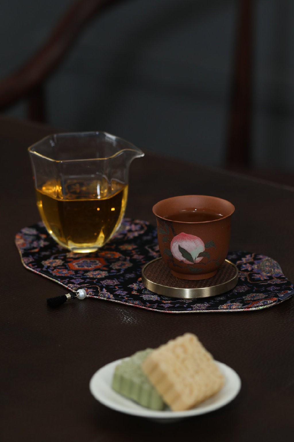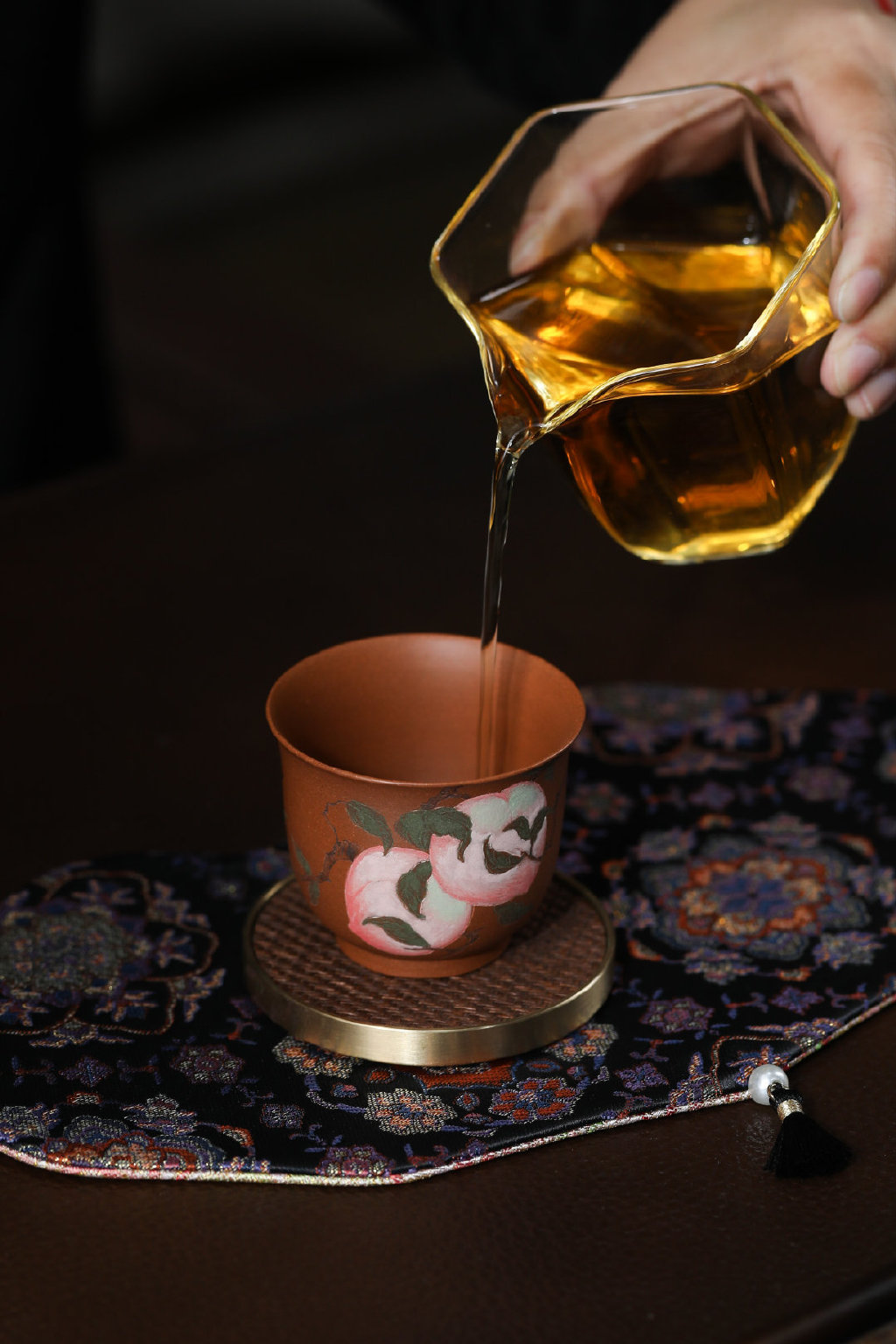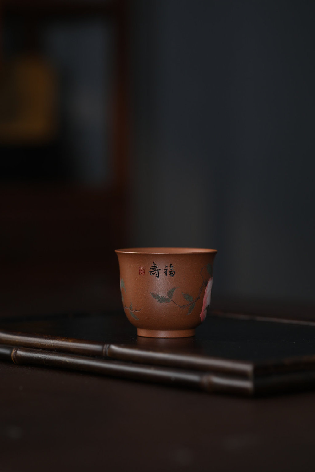 作品凭借精湛泥绘技艺,以工笔画般的细腻笔触,将一幅生机盎然的寿桃图绘于杯上,赋予其鲜明的艺术感染力,传递出“福寿安康”的深情寄望。