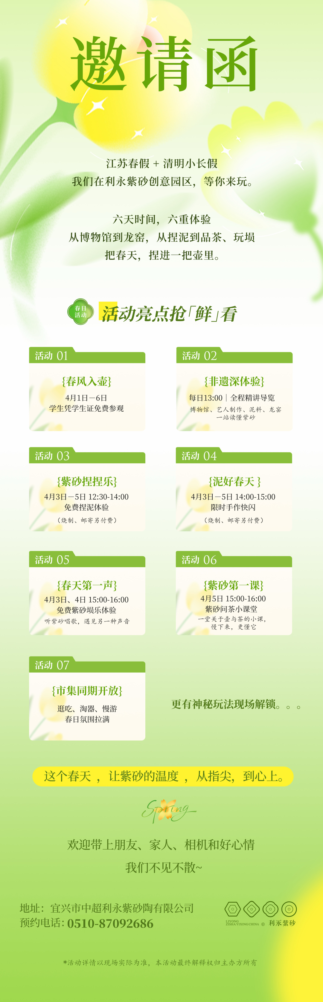春假临近,当和煦的春风拂过,一场别开生面的非遗文化盛宴正静待您的到来。4月1日至6日,利永紫砂隆重推出“指尖上的春天”非遗紫砂文化周活动,邀您在泥土的芬芳与茶香的氤氲中,触摸千年紫砂技艺的温度,感受传统工艺在春日里的勃勃生机。